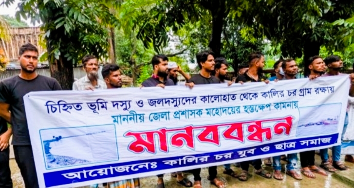 চিহ্নিত ভূমিদস্যু ও জলদস্যুদের কালো হাত থেকে মুন্সীগঞ্জ সদর উপজেলার আধারা ইউনিয়নের কালিরচর গ্রাম রক্ষায় জেলা প্রশাসকের হস্তক্ষেপ কামনায় মানববন্ধন ও স্মারকলিপি পেশ কর্মসূচি পালিত হয়েছে। বৃহস্পতিবার দুপুর ১টার দিকে ‘কালীরচর যুব ও ছাত্র সমাজ’ এর ব্যানারে জেলা প্রশাসক কার্যালয় প্রাঙ্গণের সামনের সড়কে মানববন্ধন কর্মসূচি হয়। এতে বিভিন্ন বয়সী শতাধিক ব্যক্তি অংশ নেন। মানববন্ধন চলাকালীন দস্যুদের পক্ষে ২০-২৫ জনের একটি দলের বাঁধায় মানববন্ধন পণ্ড হয়ে যায় বলে অভিযোগ করেন মানববন্ধনকারীরা। পরে তারা জেলা প্রশাসক বরাবরা স্মারকলিপি দেন। কালীরচর গ্রামবাসীর পক্ষে কাঞ্চন বেপারীর স্বাক্ষরিত মুন্সীগঞ্জ জেলা প্রশাসক বরাবর স্মারকলিপিতে বলা হয়- কালিরচর গ্রামের মৃত আব্দুল খালেক মিয়াজির পুত্র নৌ-ডাকাত গোলাম কিবরিয়া মিয়াজি (৫০) দীর্ঘদিন যাবৎ মুন্সীগঞ্জ সদর থানার চরআব্দুল্লাহ মৌজার কালিরচর গ্রামের আরএস রেকর্ড ভূক্ত জনগনের চাষী জমিগুলো সরাসরি কেটে নিয়ে যাচ্ছে এবং প্রতিদিন পদ্মা-মেঘনা নদী থেকে ২৪ ঘণ্টা ড্রেজার লাগিয়ে অবৈধভাবে বালু উত্তোলন করে যাচ্ছে। এই নৌ-ডাকাত গোলাম কিবরিয়া মিয়াজি আইনের কোন তোয়াক্কা না করে বালু খেকো, বালু দস্যু, নদী দস্যু ও ভূমি দস্যু নৌ-ডাকাত গোলাম কিবরিয়া মিয়াজী দিনের পর দিন পদ্মা ও মেঘনা নদী থেকে অবৈধভাবে বালু উত্তোলিত করতেছে এবং জনগণের রেকর্ড ভূক্ত চাষী জমিগুলো প্রতিনিয়ত কেটে যাচ্ছে। এই এলাকার জমিগুলো শতভাগ অংশই মুন্সীগঞ্জ সদর থানায় অবস্থিত।