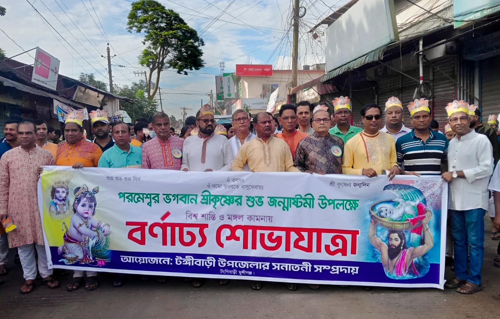 পরমেশ্বর ভগবান শ্রীকৃষ্ণের শুভ জন্মাষ্টমী উপলক্ষে টঙ্গীবাড়ি সনাতনী সম্প্রদায় এর উদ্যোগে এক বর্ণাঢ্য শোভাযাত্রা অনুষ্ঠিত হয় । এতে উপস্থিত ছিলেন মুন্সিগঞ্জ জেলা পূজা উদযাপন পরিষদের আহ্বায়ক স্বপন মোদক জেলার সাবেক সাধারণ সম্পাদক নবীন কুমার রায়, সাবেক সহ - সভাপতি বিমল পাল, সাবেক সহ - সাংগঠনিক সম্পাদক ও উপজেলা হিন্দু বৌদ্ধ খ্রিস্টান ঐক্য পরিষদের সদস্য সচিব সাংবাদিক টিটু চৌধুরী, সাবেক সমাজকর্ম সম্পাদক বিশ্বনাথ ঘোষ, উপজেলা পূজা উদযাপন পরিষদের সভাপতি কেশব ঘোষ, উপজেলা পূজা উদযাপন পরিষদের সাবেক সভাপতি মহাদেব গোপ, উপজেলা পূজা উদযাপন পরিষদের সাধারণ সম্পাদক প্রভাষক পরিতোষ ঘোষ বাবু উপজেলা হিন্দু বৌদ্ধ-খ্রিষ্টান পরিষদের আহ্বায়ক গনেশ দেবনাথ উপজেলা পূজা উদযাপন পরিষদের সহ-সভাপতি রঞ্জিত দেবনাথ, দিলীপ ঘোষ যুগ্ম সাধারণ সম্পাদক জয়ন্ত ভট্টাচার্য হিন্দু কল্যাণ ট্রাস্টের সাধারণ সম্পাদক বিপ্লব গোপ কোষাধক্ষ্য সুবল দাস সাংগঠনিক সম্পাদক অমিত সরকার গোবিন্দ, দপ্তর সম্পাদক সরোজ ব্যানার্জি, সহ সাংগঠনিক সম্পাদক বিজয় দাস ,সহ কোষাধ্যক্ষ প্রদীপ মন্ডল ,প্রচার সম্পাদক কমল মন্ডল ও স্বপন ঘোষ, সাংস্কৃতিক সম্পাদক বিধান ঘোষ গ্রন্থনা ও প্রকাশনা সম্পাদক পরিমল ঢালি ও সত্যজিৎ দাস ,মন্দির রক্ষণাবেক্ষণ সম্পাদক নবীন গোপাল সদস্য শংকর কর্মকার ,বানেশ্বর পোদ্দার, নীলকমল মনি ,তাপস দাস যুব ঐক্য পরিষদের আহ্বায়ক রিপন গোপ এবং সদস্য সচিব সুজন দেবনাথ সহ ইউনিয়ন পূজা উদযাপন পরিষদের নেতৃবৃন্দ।