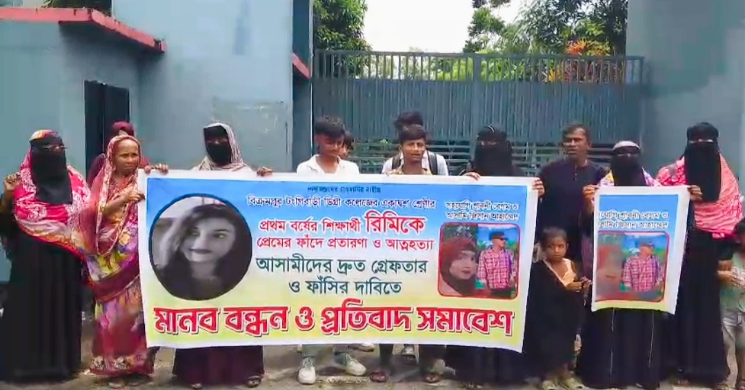 মুন্সীগঞ্জে প্রেমের ফাঁদে ফেলে অনৈতিক সম্পর্কের ভিডিও ধারণের শিকার হয়ে আত্মহত্যা করেছেন কলেজ ছাত্রী রিমি আক্তার (১৭)। রিমি আক্তার বিক্রমপুর-টঙ্গীবাড়ী ডিগ্রি কলেজের একাদশ শ্রেণির শিক্ষার্থী সে জেলার টঙ্গিবাড়ী উপজেলার রাউৎভোগ গ্রামের দেলোয়ার হোসেনের মেয়ে। ঘটনার প্রতিবাদে ও দোষীদের দ্রুত গ্রেফতার ও দৃষ্টান্তমূলক শাস্তির দাবিতে ১৭ আগস্ট রবিবার সকাল সাড়ে ১০টায় ধীপুর ইউনিয়নের ব্রাহ্মণ ভিটা ইউনিয়ন উচ্চ বিদ্যালয়ের সামনে ঘণ্টা ব্যাপী মানববন্ধন ও প্রতিবাদ সমাবেশ অনুষ্ঠিত হয় । এতে ভুক্তভোগীর পরিবার, শিক্ষক-শিক্ষার্থী, জনপ্রতিনিধি ও বিভিন্ন শ্রেণি পেশার মানুষ অংশ নেন। বক্তারা বলেন, প্রেমের নামে প্রতারণা করে এমন নৃশংসতার বিরুদ্ধে কঠোর ব্যবস্থা নেওয়া জরুরি। তারা হুঁশিয়ারি দেন দোষীদের ফাঁসি না হওয়া পর্যন্ত আন্দোলন চলবে । নিহত রিমির মা সাংবাদিকদের কান্নাজড়িত কণ্ঠে বলেন, প্রায় ১৬ মাস ধরে দ্বারে দ্বারে ছোটাছুটি করছি, কিন্তু আমার মেয়ের কোনো বিচার পাচ্ছি না। মামলা দিয়ে আমি নিঃস্ব হয়ে যাচ্ছি। এ বিষয়ে জানতে চাইলে টঙ্গিবাড়ী থানার ওসি মো. মহিদুল ইসলাম বলেন, মোবাইলে নয় বক্তব্যর দরকার হলে অফিসে এসে নিবেন।