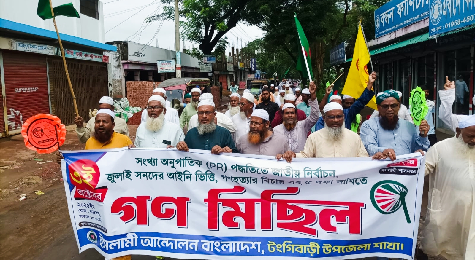 মুন্সীগঞ্জ টঙ্গিবাড়ী উপজেলার শুক্রবার সকাল ১১ টায় ইসলামী আন্দোলন বাংলাদেশ টঙ্গীবাড়ি উপজেলা শাখার উদ্যোগে পি আর পদ্ধতিতে নির্বাচন প্রয়োজনীয় রাষ্ট্রের সংস্কার জুলাই গণহত্যর দৃশ্যমান বিচারসহ সহ পাঁচদফা দাবিতে গণ মিছিল অনুষ্ঠিত হয় । উক্ত গণ মিছিলে সভাপতিত্বে করেন আলহাজ্ব আব্দুল হাকিম ঢালী সভাপতি ইসলামী আন্দোলন বাংলাদেশ টঙ্গীবাড়ী উপজেলা শাখা গণ মিছিল পরিচালনায় ছিলেন ডাক্তার মোঃ ওবায়দুল্লাহ সরদার সেক্রেটারি ইসলামী আন্দোলন বাংলাদেশ টঙ্গীবাড়ী উপজেলা শাখা উক্ত গণ সমাবেশে ইসলামী আন্দোলন বাংলাদেশ মুজাহিদ কমিটির সহ সকল ইউনিয়ন শাখার এবং ওয়ার্ড শাখার বিভিন্ন স্তরের দায়িত্বশীল গণ উপস্থিত ছিলেন এবং বিভিন্ন নেতৃবৃন্দ গন পাঁচ দফা দাবিতে বক্তব্য রাখেন, মোহাম্মদ আক্তার শেখ সহসভাপতি ইসলামী আন্দোলন বাংলাদেশ উপজেলা শাখা, মোহাম্মদ দেলোয়ার শিকদার,সহ-সভাপতি ইসলামী আন্দোলন বাংলাদেশ টঙ্গীবাড়ি উপজেলা শাখা, আব্দুল আউয়াল হাওলাদার সহ-সভাপতি টঙ্গীবাড়ী উপজেলা শাখা,মিরাজ হোসেন গাজী, যুগ্ন- সাধারন সম্পাদক ইসলামী আন্দোলন