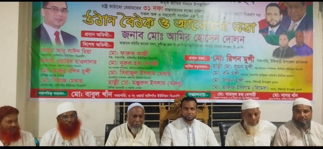 মুন্সীগঞ্জের টঙ্গিবাড়ী উপজেলায় বাঁলিগাও বাজারে ১লা নভেম্বর শনিবার রাত ৭টার সময় দেশ নায়েক তারেক রহমান কতৃক জাতির সামনে উপস্থাপিত রাষ্ট কাঠামো মেরামতের ৩১ দফা বাস্তবায়নের লহ্ম্যে বাঁলিগাও ইউনিয়ন ৩নং ওর্য়াড বিএনপির অঙ্গসংগঠনের নেতীবৃন্দের উদ্যাগে উঠান বৈঠক ও আলোচনা সভা অনুষ্ঠানের আয়োজন করেন । বাবুল খানের সভাপতিত্বে প্রধান অতিথি হয়ে উপস্থিত ছিলেন, টঙ্গিবাড়ী উপজেলা বিএনপি সাধারন সম্পাদক আমির হোসেন দোলন, প্রধান বক্তা হয়ে উপস্থিত ছিলেন টঙ্গিবাড়ী উপজেলা শ্রমিকদল সভাপতি রিপন মুন্সী, বিশেষ অতিথি হয়ে উপস্থিত ছিলেন বাঁলিগাও ইউনিয়ন বিএনপি সভাপতি আবু সাইদ মিয়া, সহ- সভাপতি ফারুক কাজী,সাধারন সম্পাদক ওয়াহিদ হালদার, কোষাধক্ষ্য সিরাজ মেম্বার, উপজেলা বিএনপি সাংস্কৃতিক বিষয়ক সম্পাদক মনির শেখ, বিএনপি নেতা রশিদ মুন্সী, যুগ্ন- সাধারন সম্পাদক নূরুল হক বেপারী ও সুমন মুন্সী, মেম্বার দ্বীন ইসলাম মেম্বার, কুদ্দুস মেস্বার, আপেল মাহমুদ প্রতিক, আনোয়ার বেপারী, টঙ্গিবাড়ী উপজেল যুবদল যুগ্ন- আহবায়ক বি এম মাঞ্জুর, সদস্য মারুফ ইসলাম রিমেল, সাজন মুন্সী, বিএনপি নেতা জুয়েল হালদার, বাঁলিগাও ইউনিয়ন সেচ্ছাসেবকদল আহবায়ক মো: হারুন, বাঁলিগাও ইউনিয়ন ছাত্রদল সভাপতি আসলাম সরদার, সাধারন সম্পাদক রিমন মাল, আড়িয়ল ইউনিয়ন ছাত্রদল সভাপতি মো: শান্ত সহ বিএনপি বিভিন্ন অঙ্গসংগঠনের নেত্রীবৃন্দ। অনুষ্ঠানটি সঞ্চালনা করেন সামসুল হক বেপারী ও সাগর খান ।